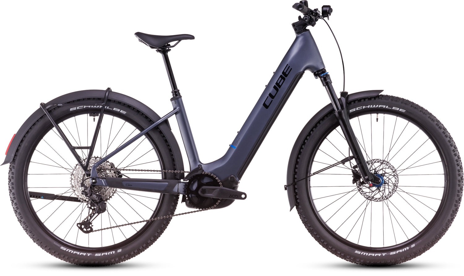 Frame: Wat direct opvalt aan de Reaction Hybrid Allroad is de esthetisch aantrekkelijke, praktische uitrusting, bestaande uit spatborden, verlichting, bagagedrager en zijstandaard. Maar dat is nog lang niet alles. Het lage instapframe doet zijn naam eer aan, omdat het eenvoudig op- en afstappen mogelijk maakt. De 800 Wh PowerTube-accu en de Bosch CX-motor zijn zo mooi, strak en veilig geïntegreerd in het ontwerp dat ze nauwelijks opvallen. Bovendien is het chassis PowerMore-ready, wat betekent dat indien nodig nog eens 250 Wh mee kunnen rijden. Daarnaast benadrukken de geïntegreerde zadelklem en de interne kabelgeleiding het cleane uiterlijk. Wat nog meer? Een UDH voor eenvoudige beschikbaarheid van reserveonderdelen, een bevestiging voor een kettinggeleider en de mogelijkheid om ACID-spatborden achteraf te monteren. Last but not least hebben we dankzij vele verschillende maten voor vrijwel elke rijder de perfecte pasvorm in het aanbod. Conclusie: Alles wat belangrijk is – voor maximaal rijplezier!