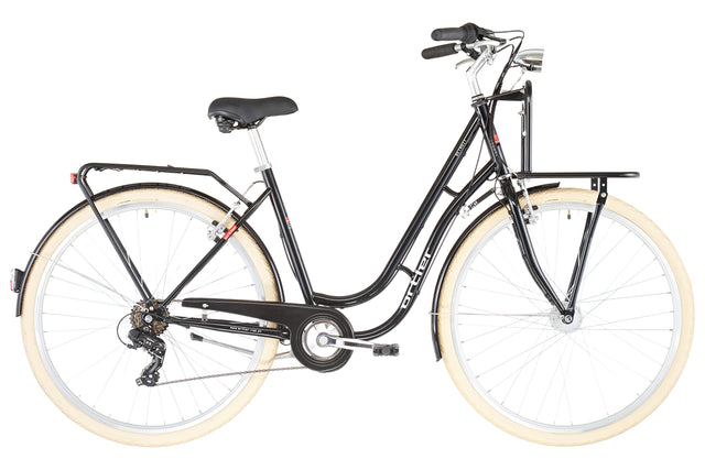 De beproefde Shimano Tourney zesversnellingsbak helpt je om je tempo te variëren en de juiste versnelling te vinden voor elke situatie in de stad, wat vooral belangrijk is als je veel bagage op de bagagerekken voor en achter hebt geladen. Deze fiets ziet er niet alleen goed uit, hij kan je boodschappen ook door de stad vervoeren.