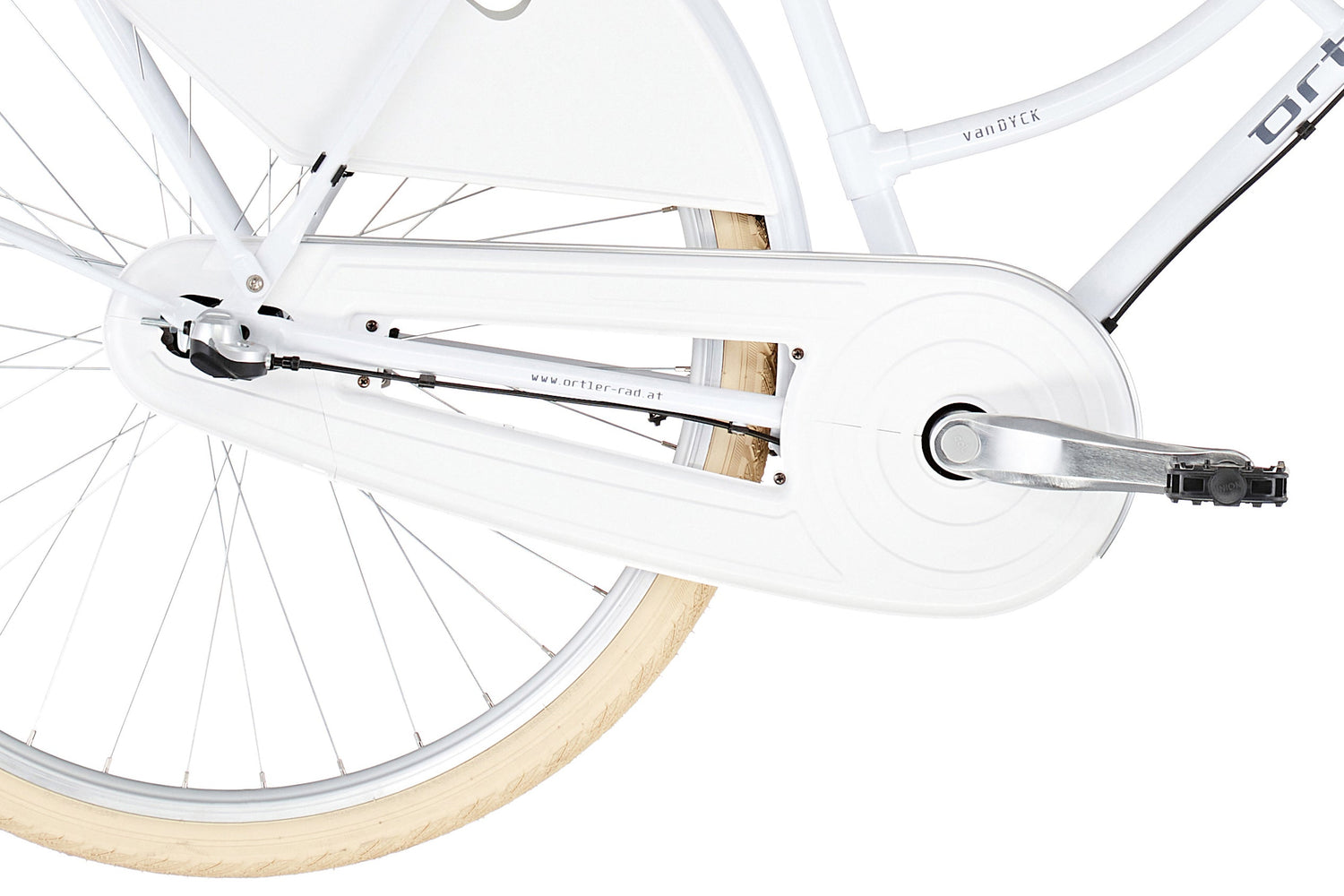 De Ortler Van Dyck is bedoeld voor iedereen die op zoek is naar een moderne fiets in de stijl van de goede, oude "Hollandfiets". Het motto was duidelijk: eenvoud en terugbrengen tot het essentiële, om een Hollandfiets met hoogwaardige afwerking tegen een aantrekkelijke prijs te realiseren. De schokbestendige poedercoating sluit het zorgvuldig afgewerkte stalen frame betrouwbaar af. Het vermijden van slijtagegevoelige onderdelen en de Shimano Nexus 3-versnellingsnaaf met terugtraprem maken de Ortler Van Dyck tot een trouwe metgezel voor jaren. Het geheel wordt afgerond met een betrouwbare Shimano naafdynamo en een modern LED-achterlicht. Zo wordt de Ortler Van Dyck de ideale metgezel in het stadsleven.