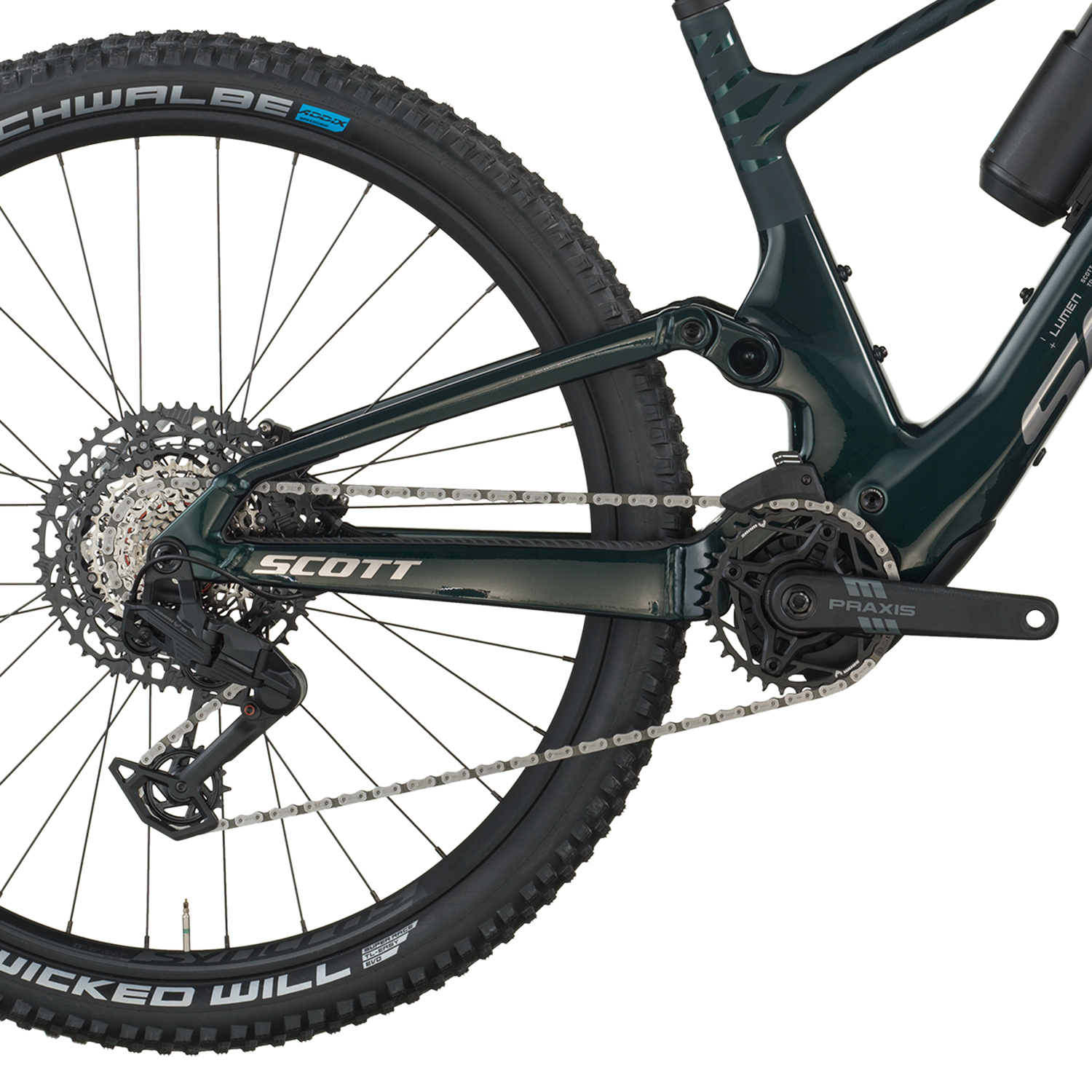 De Lumen 910 is uitgerust met een helder verlicht zwart-wit display en beschikt over 140 mm veerweg aan de voorkant en 130 mm aan de achterkant, evenals een SRAM Eagle 70 derailleur.