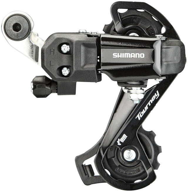 De SHIMANO TOURNEY TY200 achterderailleur, compatibel met 6- en 7-speed SIS Index-schakelingen, biedt betrouwbare schakelprestaties en een sportief design.
