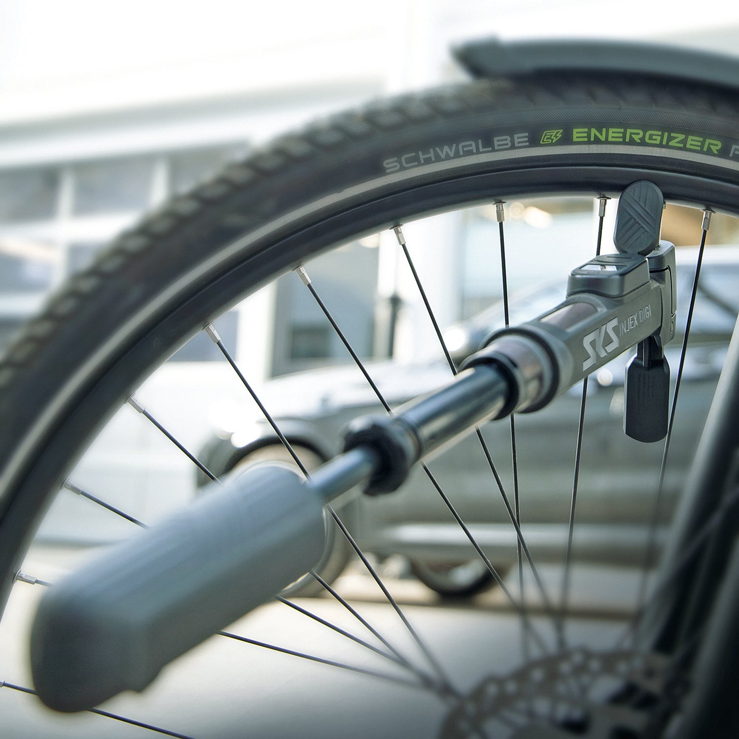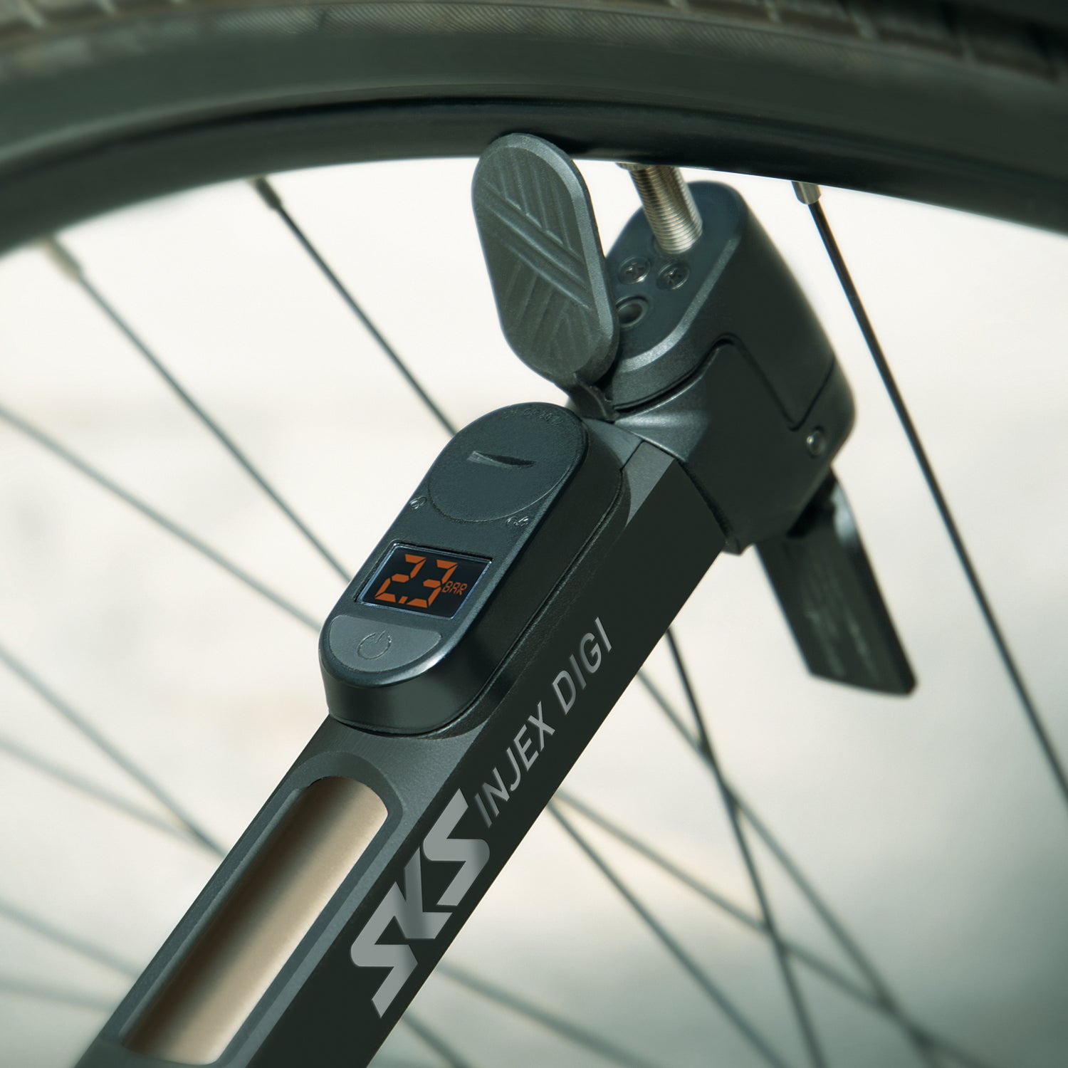 Volledige controle: De INJEX CONTROL DIGI is uitgerust met een digitaal, goed afleesbaar manometer, dat onderweg nauwkeurige drukmetingen mogelijk maakt. Daarnaast beschikt hij over een getextureerde 2-componenten handgreep en een ergonomische ommanteling van de compressiebuis. Het T-handvat is 60 graden gekanteld, zodat onderarm en minipomp tijdens het pompen een rechte lijn vormen. Dit zorgt ook bij langdurig pompen voor een ergonomisch en comfortabel gebruik. De 5 graden gekantelde pompkop maakt het oppompen van banden eveneens aanzienlijk eenvoudiger. De inschakelbare telescopische functie zorgt voor meer volume per slag en verhoogt tegelijkertijd de maximaal bereikbare druk. De MV EASY-kop voor alle ventieltypen garandeert efficiënt pompen. De in het ontwerp geïntegreerde klemmhendel zorgt voor een betrouwbare ventilverbinding. Dankzij de pompbeugel kan de fietspomp ruimtebesparend aan het frame worden bevestigd. De met kunststof beklede aluminium compressiebuis maakt de pomp stabiel en duurzaam.