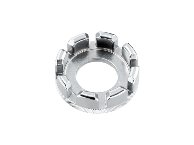 Platte en handzame spaaknippelspanner voor het eenvoudig spannen en ontspannen van 13G (3,5 mm), 14G (3,4 mm), 15G (3,2 mm) en Shimano (4,3 mm) nippels. Voor maximale precisie CNC gefreesd.