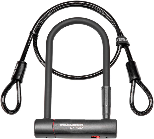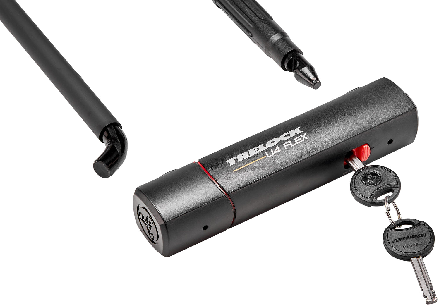 Het instapmodel U4 van de nieuwe Trelock beugelslotserie overtuigt, net als de rest van de serie, door zijn aantrekkelijke productontwerp. Maar ook de innerlijke waarden kloppen hier. Een 14 mm dikke beugel van gehard staal en een veilige schijfcilinder maken het fietsendieven moeilijk. De Flex-variant biedt daarnaast een luskabel om de fiets aan een vast object vast te maken.