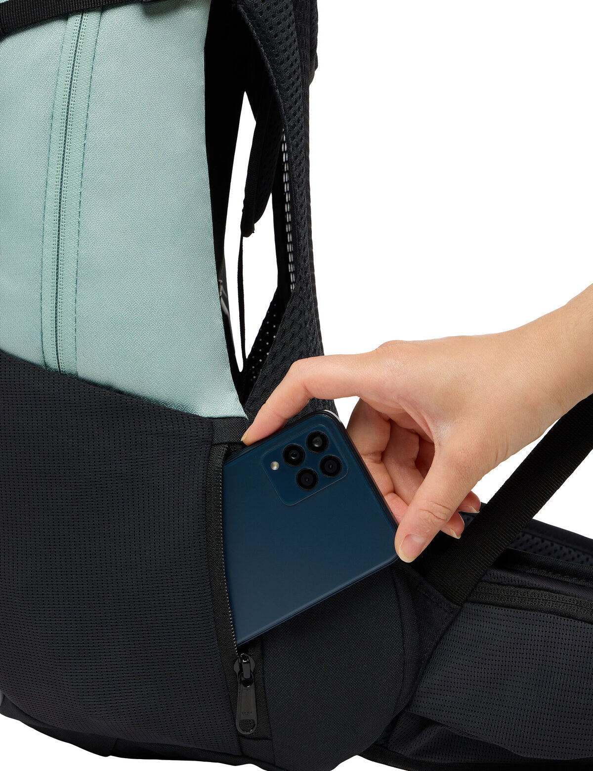 Voor de spontane mountainbiketocht! De Trailvent 15 fietsrugzak voor dames is hier ideaal voor. Hij overtuigt met zijn uitstekend geventileerde Aeroflex 3D-rugventilatiesysteem en biedt dankzij de verstelbare ruglengte en goed gewatteerde, op de vrouwelijke anatomie afgestemde heup- en schouderbanden evenals een borstband met slanghouder langdurig draagcomfort. De indeling van de vakken is doordacht: een apart vak voor een drinkzak, een ritstasje voor waardevolle spullen en een sleutelhanger bevinden zich in het grote hoofdvak. In het voorvak kunnen een fietspomp, gereedschap en een reserve binnenband worden opgeborgen. Zijdelingse compressieriemen in het bovenste derde deel beveiligen de inhoud, terwijl netbuitenzakken zorgen voor snel bereikbare voorwerpen. Een helmhouder, een houder voor een knipperlicht, grote reflecterende elementen en een geïntegreerde regenhoes maken de uitrusting compleet. De fietsrugzak voor dames is voorzien van een waterafstotende Eco Finish zonder PFC. Het VAUDE Green Shape-label staat voor een milieuvriendelijk, functioneel product gemaakt van duurzame materialen.