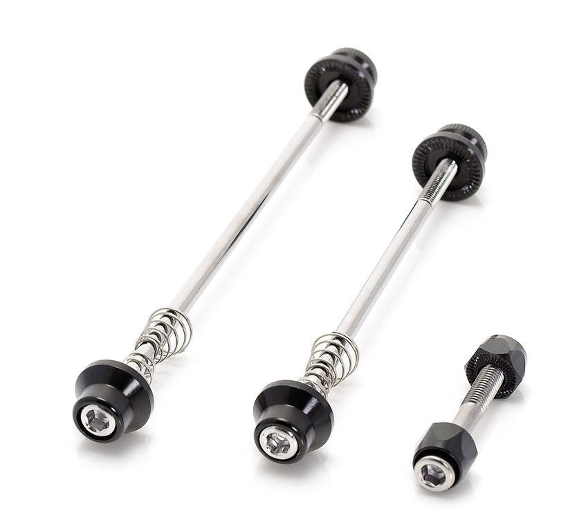 Deze beveiligingsset is gemaakt van staal en vervangt de traditionele snelspanners in de wielen en de zadelklem door schroefassen. Hierdoor wordt diefstal van de wielen of het zadel zonder gereedschap voorkomen. De schroefassen kunnen worden afgesloten/geopend met een binnenzeskantsleutel.